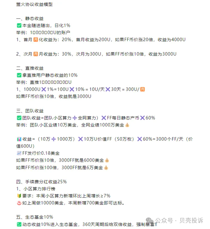 与此同时,项目还设计了动态传销机制:直推奖励10%,团队奖励60%,但要求每周小区新增业绩≥7%,否则触发“熔断”,逼迫用户不断拉人头续命。