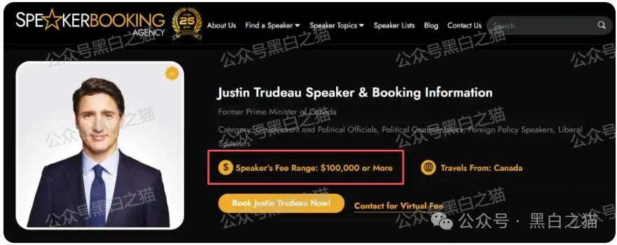 据National Post于9月10日报道,代理演讲业务的演说家预订机构(Speaker Booking Agency),安排前加拿大总理贾斯廷·杜鲁多在韩国完成演讲,出场费10万刀,还能提供线上“陪聊”。