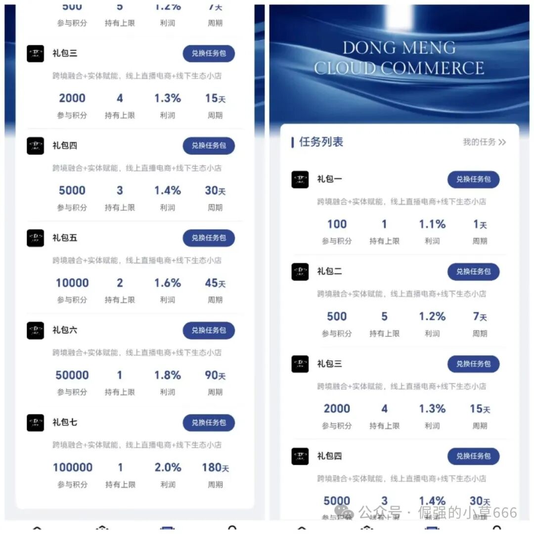 如今,“东盟云商”又来了,而且玩得更狠。它一口气推出7个等级礼包:100元、500元、2000元、5000元、1万元、5万元、10万元,对应的日收益率也层层加码:1.1%、1.2%、1.3%、1.4%、1.6%、1.8%,最高甚至达到2.0%!越投越多,收益越高,诱惑你不断加码,直到掏空所有积蓄。