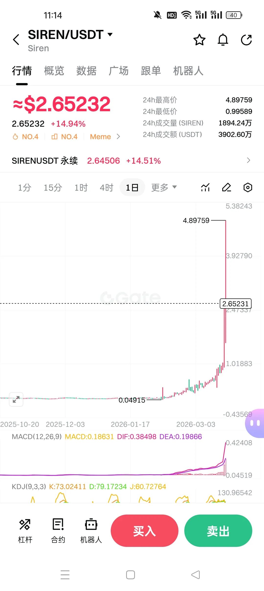 - 极速拉盘期:2026年1月后,代币开启暴力拉升,从0.04915美元一路暴涨到4.89759美元,短短2个月涨幅近100倍,K线连续大阳线,24小时最高价直接冲到4.89759,用极致的涨幅吸引散户FOMO(Fear Of Missing Out,害怕错过)。