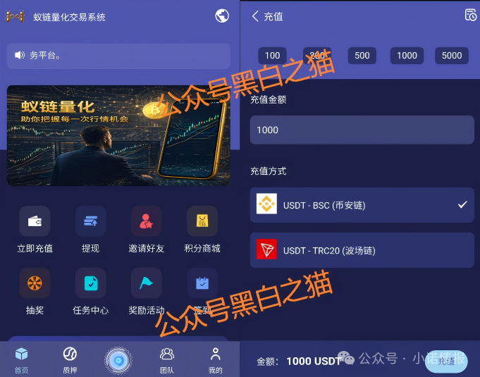 “蚁链量化交易系统”已经运营有月余,在APP里面介绍中,虚构以科技为核心驱动力的智能量化服务平台,专注于将人工智能、大数据分析与自动化策略模型应用于数字资产领域等等虚假内容,同样是打着“AI量化对冲”旗号,熟悉的配方熟悉的味道,小编找了半天也没看到主体公司信息,感觉是幽灵平台。