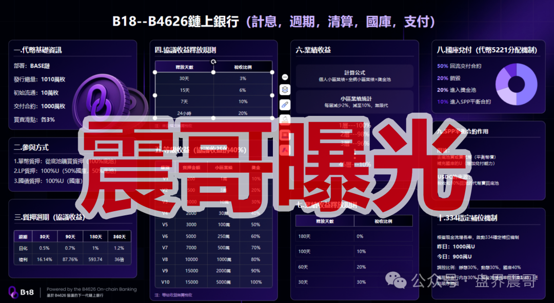 最近B18这个“链上银行”项目在圈子里刷屏了。私募阶段就搞了近500万U,朋友圈、社群里全是“百倍币”“控盘稳”的宣传。项目方说自己融合了奥拉丁、拉菲、奥林巴斯道的牛逼模式,还优化升级了,甚至传出操盘手是奥拉丁的老板“二哥”和“天天”。我直接说结论:B18就是个空气币资金盘,没有技术落地,没有价值支撑。所谓的协议、产品、收益、优化升级,全是包装噱头。本质就是质押本金拿分红的卷轴模式,跟奥拉丁、ARK那些币本位项目一个路子。