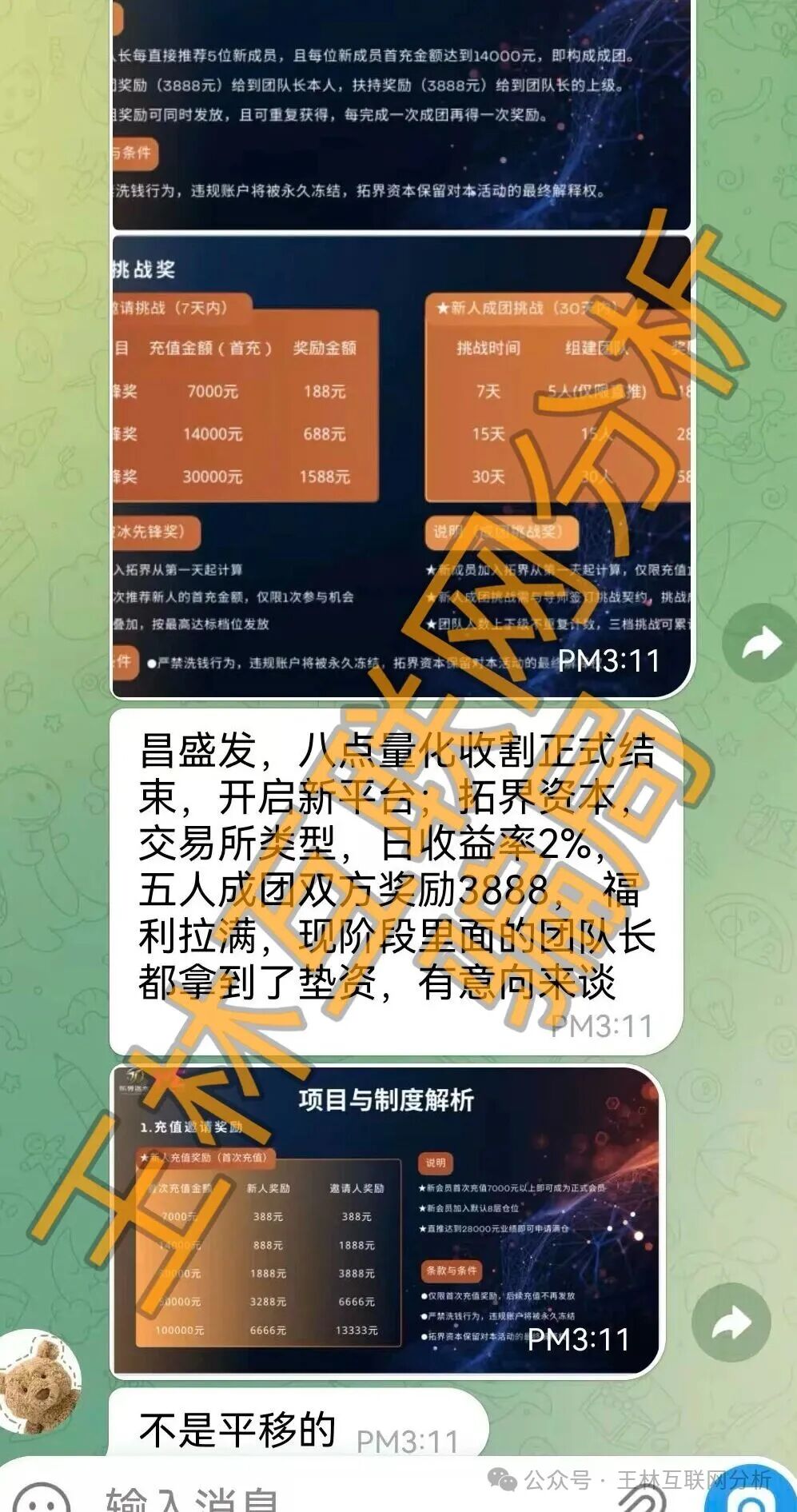 这个拓界资本据说是八点量化和昌盛发的项目方, 应该也是老熟人了 ,据说是之前联众公司分离出来的导师开的,之前还平移了一个叫做大赢家的项目 ,大赢家平移十来天就单割了,现在又搞出来这个拓界资本,现在这些吊毛完完全全开始搞快杀盘,看见一定要远离...