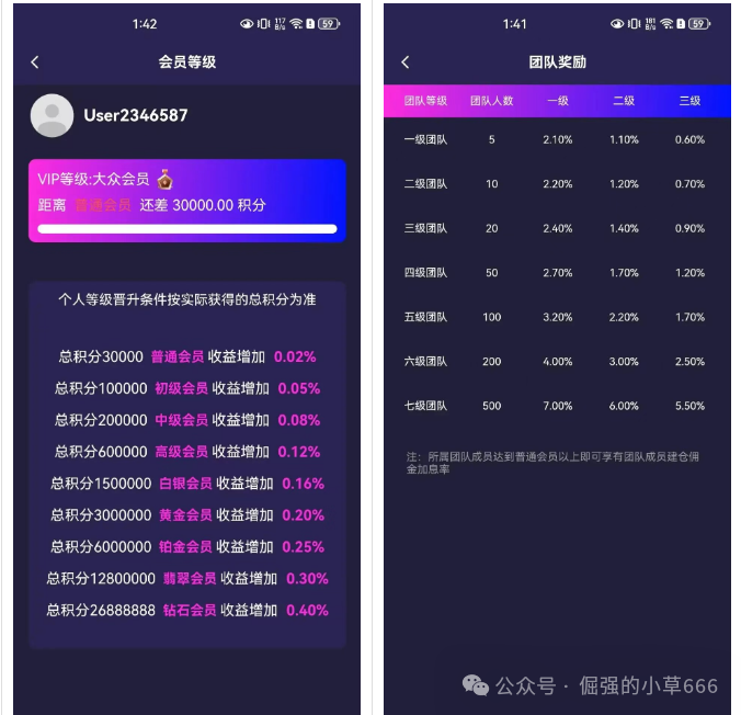 通过设置复杂的会员等级和三级分销的团队奖励,荣辉资本将贪婪的人性利用到了极致。等级越高,收益加成越多;拉的人越多,团队佣金越丰厚。