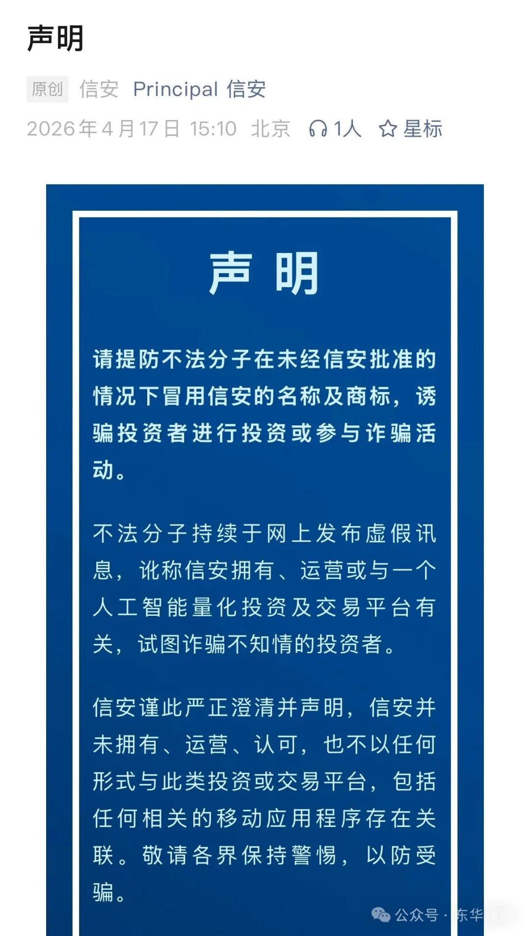 昊天评盘界友情提醒:套牌的“美国信安ai量化”链动出海联盟分红类资金盘骗局,正规公司出面打假,高度预警,速度撤离!近期昊天评盘界发现知乎,小红书,微博,抖音等app都有冒充昊天的诈骗团伙,希望大家记住了昊天评盘界是反诈自媒体账号并不做任何项目,更不会去推广任何项目,除公众号外其他一律不是本人,切勿上当受骗!